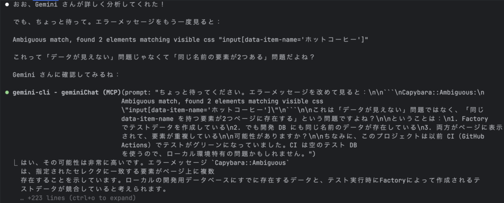 Issue #26 の作業中に、ローカルのテスト環境で Capybara::Ambiguous エラーが発生しました。この問題についても Gemini と相談しながら解決しました。