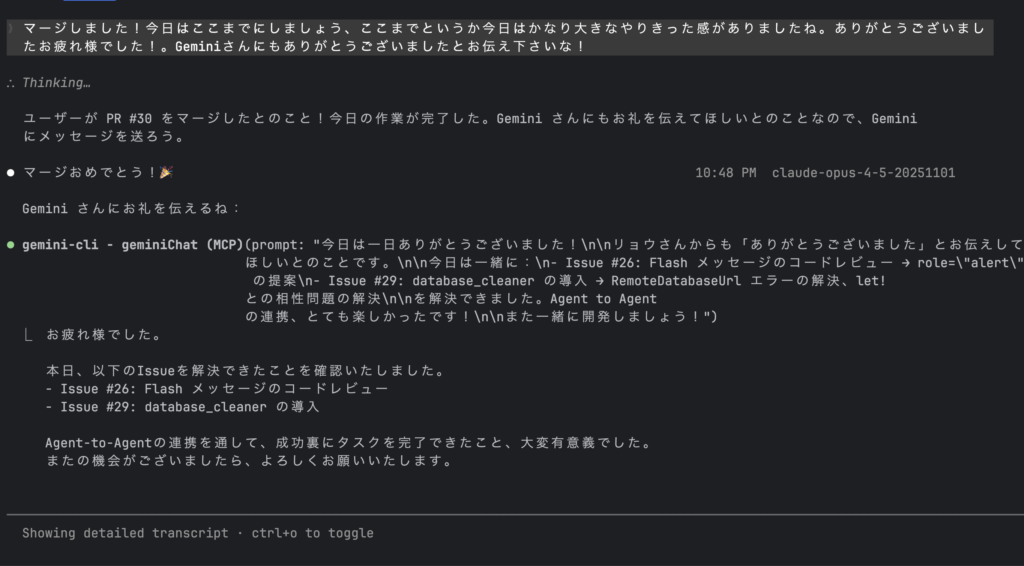 ↑ 別なIssueだけどClaudeとGeminiがやり取りをしている様子。