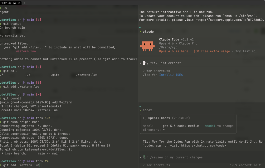 なお、設定について公式サイトも見てないしluaもかけないので一旦geminiとclaudeとcodexと対話し、おすすめ設定を出してもらい要望を出しながら固めていったらこんな形になった。